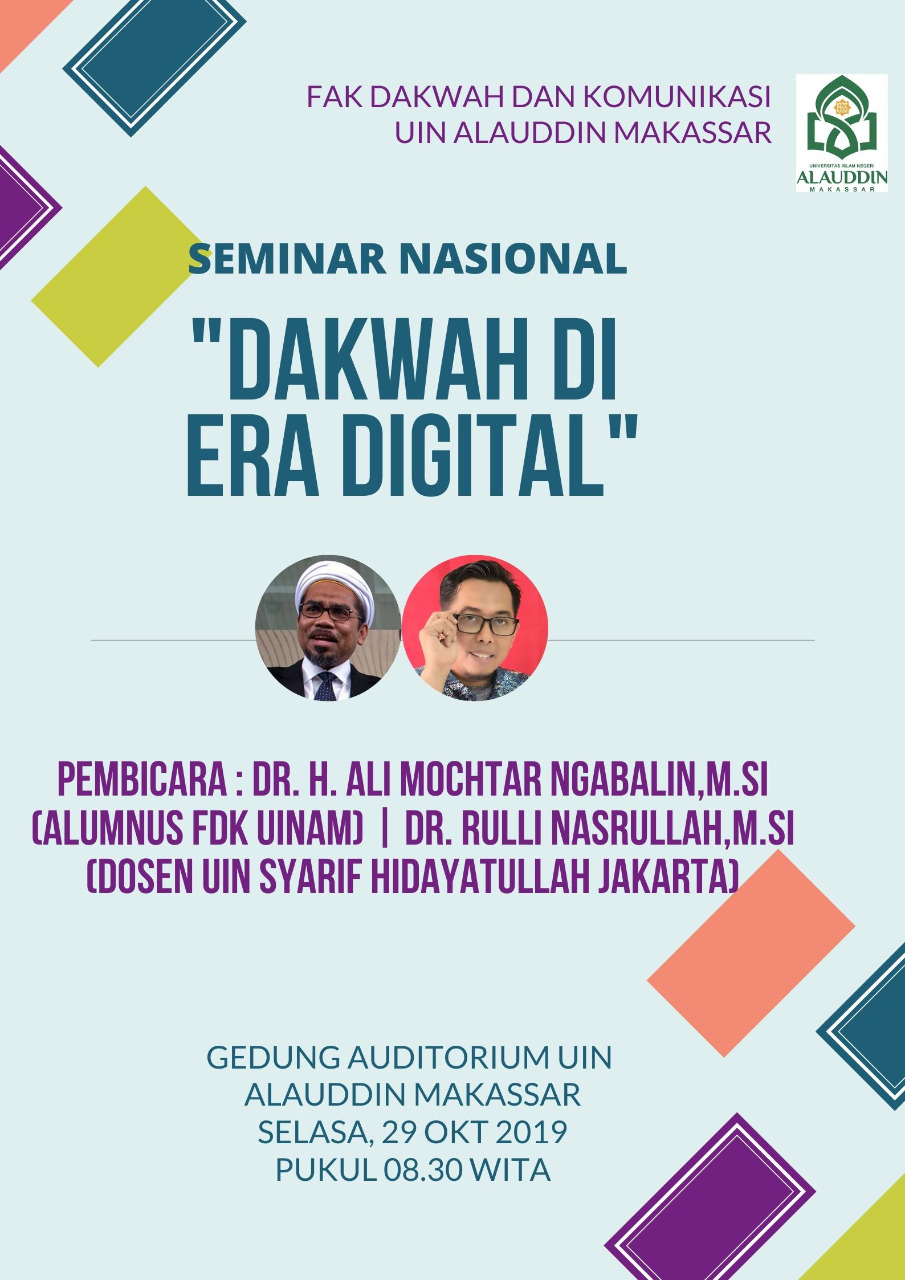 Jurnalistikuinam.com – Fakultas Dakwah dan Komunikasi (FDK) UIN Alauddin Makassar melaksanakan seminar Nasional dengan tema “Dakwah di Era Digital”. Seminar Nasional ini menghadirkan pembicara tingkat Nasional, yakni Ali Mochtar Ngabalin, dan Rulli Nasrullah. Kegiatan yang berlangsung di Gedung Auditorium UIN Alauddin Makassar, Selasa (29/10/2019).
